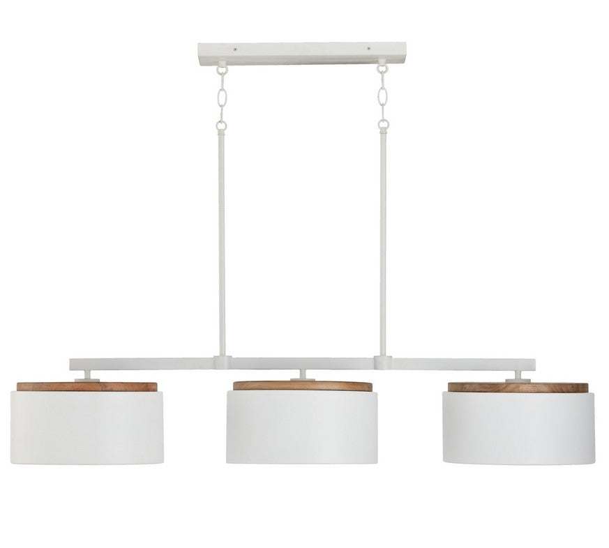 Ses abat-jours en métal blanc mat, associés à des accents en bois clair, créent un équilibre visuel harmonieux, emblématique du style scandinave naturel.