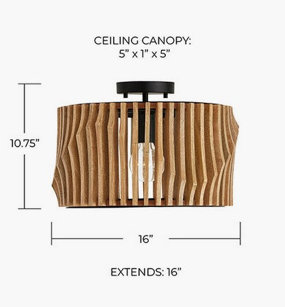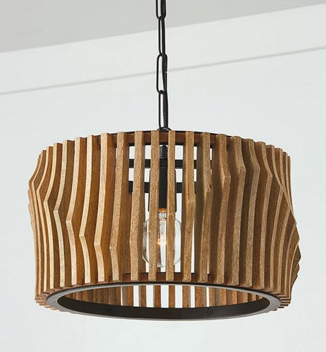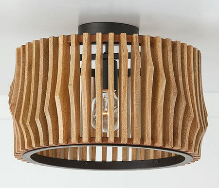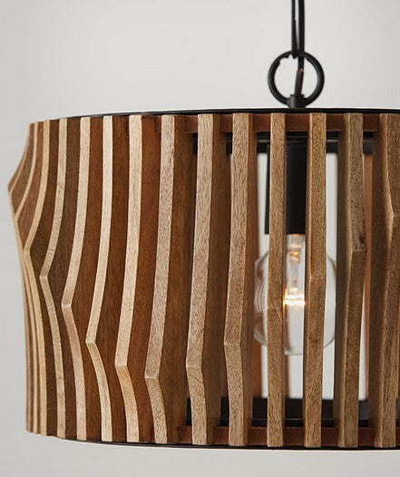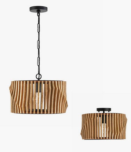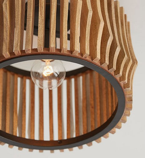 Le style sculptural du modèle Archer à double fixation est saisissant sous tous les angles. Qu’il soit suspendu en plafonnier ou monté en semi-encastré, ses lattes artisanales en bois de manguier évoquent un mouvement fluide et ondulant, sublimé par une structure en métal noir mat qui ancre l’ensemble avec élégance.